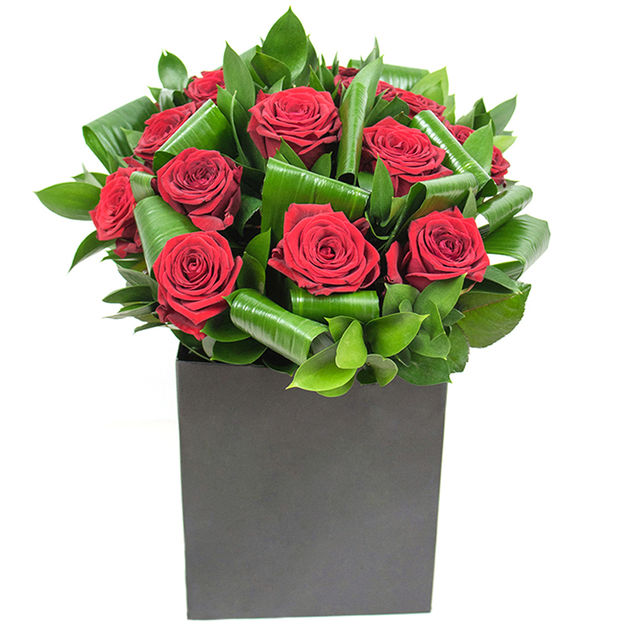 Celebrate elegance with our graceful red roses, complemented by fresh aspidistra leaves and stylish ruscus. This exceptionally designed bouquet brings luxury and beauty to any occasion.